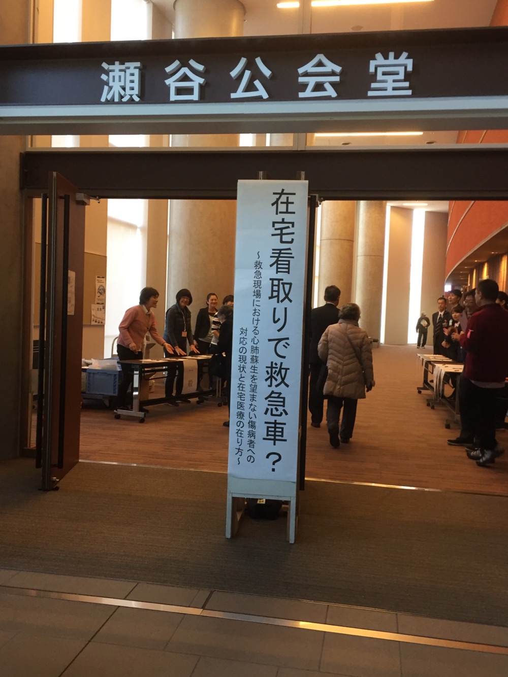11月30日に私とクリニックの看護師1名、相談員1名で「在宅看取りで救急車!?」という講演会に行ってきました。瀬谷消防署をはじめ、医師会、在宅医療相談室、訪問看護連絡会、地域包括主任ケアマネジャー部会、ケアマネットの方々が中心になり、企画・運営された会です。講演では横浜市医師会常任理事で在宅医療に尽力されている先生の発表や消防の救急救命士の方2名と警察署の方の発表を聞くことができました。