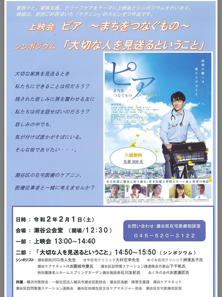 瀬谷区では、医師会、在宅医療相談室、訪問看護連絡会、地域包括主任ケアマネジャー部会、ケアマネットの方々が中心になり、企画・運営される会が時々開催されます。次回は、2月1日に「ピアまちをつなぐもの」という映画の上映会が瀬谷公会堂で行われます。この後休憩時間をはさんで「大切な人を見送るということ」というシンポジウムが予定されていますが、私がシンポジストとして参加致します。お時間がありましたらお越しください。