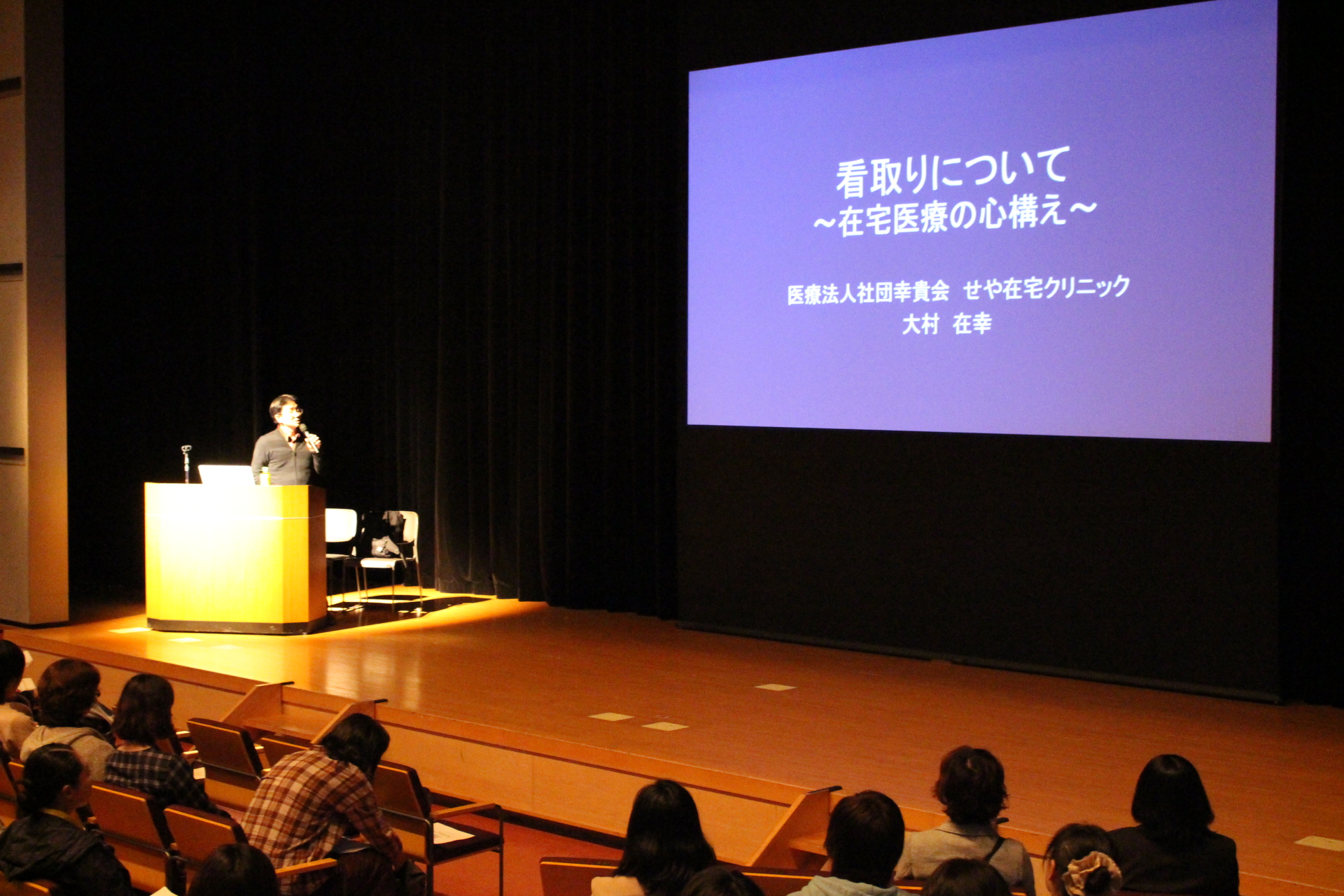 質疑応答では、一般参加の方々から意識の高い質問がいくつもありました。聴講席にいた私は質疑応答の時間の最後に、座長から地域で在宅医療を担っている医師として紹介されました。以前にがんの末期で在宅看取りの方針だった患者様がショートステイ中に心肺停止となり施設の方が救急要請した時、ショートステイ先に訪問し車内収容されて蘇生術を受けている方を救急隊から引き継いで施設でご家族とお看取りをした経験と、自宅で救急要請し病院で死亡確認された際に、病院に訪問し病院医師と話し合いの上死亡診断として診断書を交付した経験をお話しさせて頂きました。